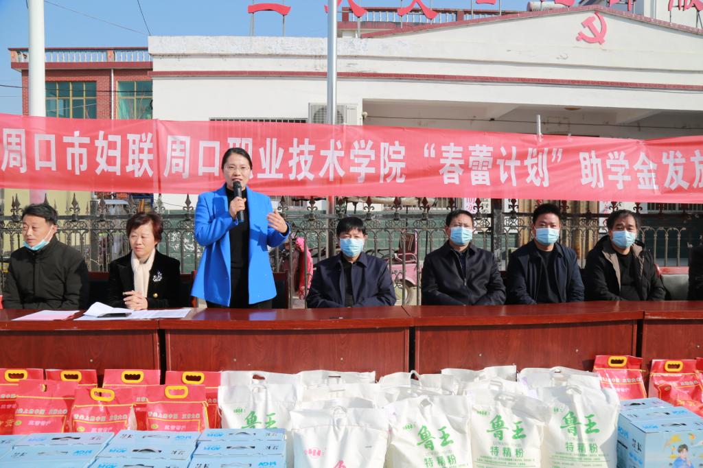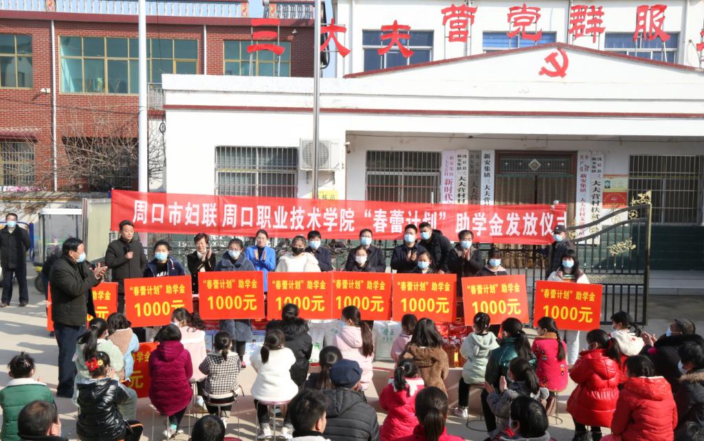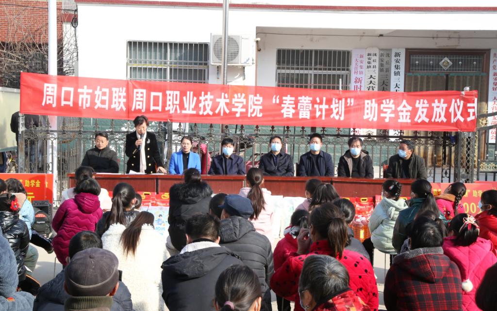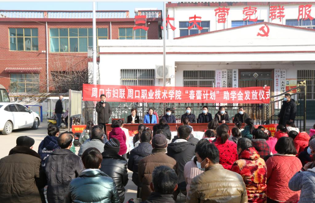 1月30日,万象城官网在定点扶贫村沈丘县新安集镇三大夫营村举行“春蕾计划”助学金发放仪式暨春节前走访慰问活动。校党委书记刘士欣、校长李清臣、周口市妇联副主席孙媛媛、校党委副书记赵振然、副校长李秀萍出席活动。活动由万象城官网驻三大夫营村第一书记王彦伟主持。