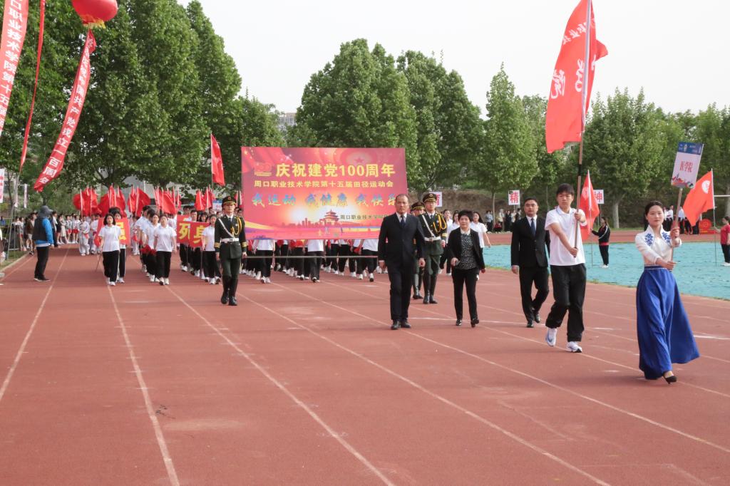 伴随着《运动员进行曲》,国旗队、会徽队、彩旗队、裁判员代表队、教职工代表队、各院部代表队等组成的方阵迈着整齐的步伐,依次走过主席台前接受检阅。