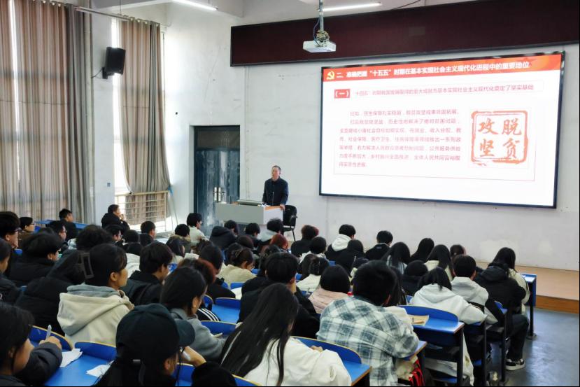 课上,郭汝礼系统解读了党的二十届四中全会精神。他围绕“十四五”规划的实施成效、经验启示,聚焦“十五五”时期的指导方针、战略任务及坚持和加强党的全面领导等方面展开讲解,重点阐述“十五五”时期我国在科技创新、法治进步、文化事业、民生保障与生态环境保护等方面采取的重大举措,引导同学们深入思考,并理解坚持党的全面领导、坚持以人民为中心、贯彻新发展理念、深化改革开放和注重系统谋划对国家发展的重要意义。