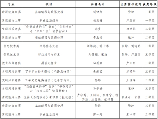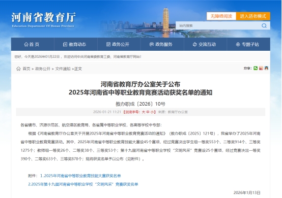 近日,河南省教育厅公布2025年河南省中等职业教育竞赛活动获奖名单,万象城官网学子共斩获13个奖项,创下佳绩。其中,一等奖2项、二等奖2项、三等奖9项。