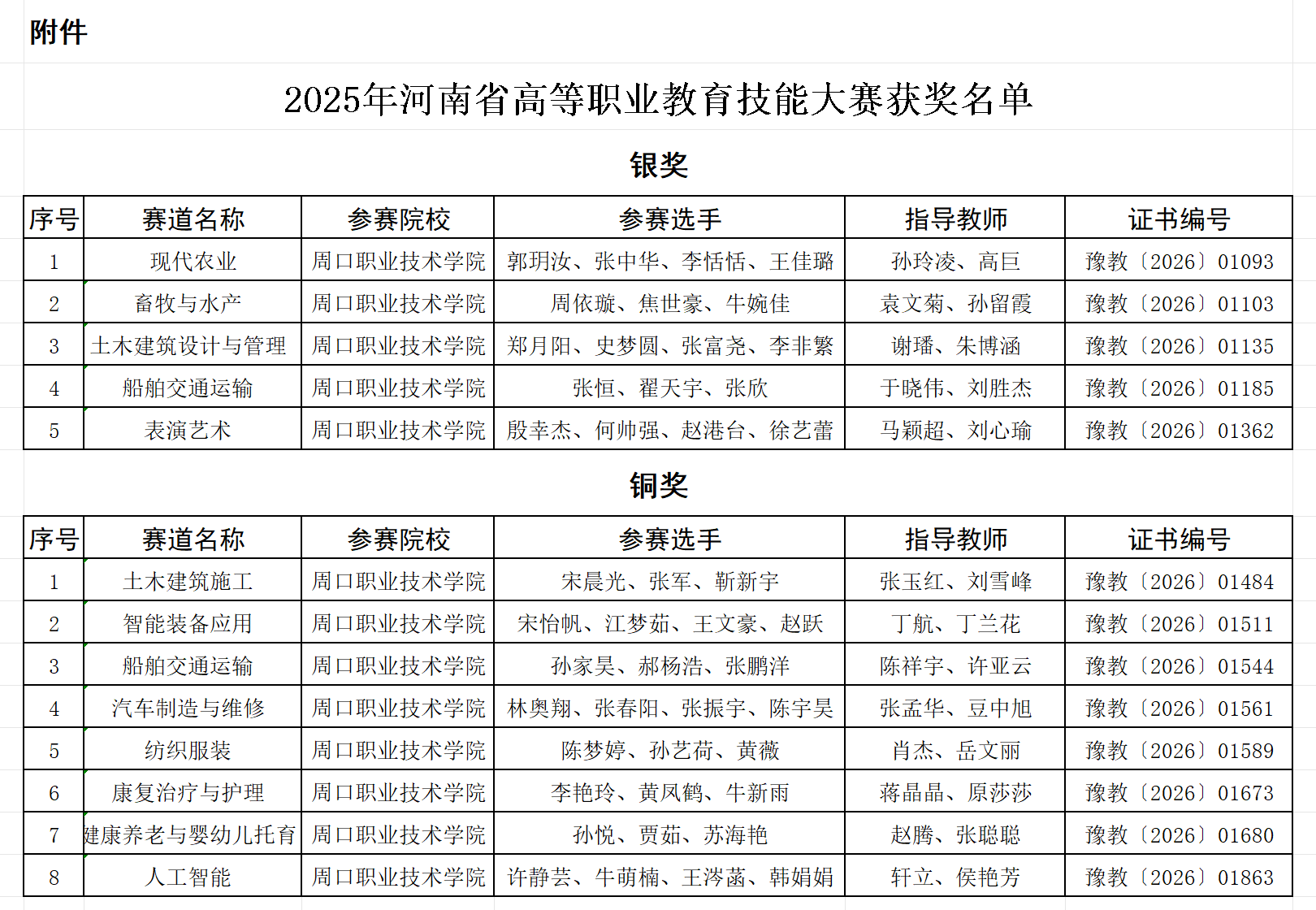近日,河南省教育厅公布了2025年河南省高等职业教育技能大赛获奖名单。万象城官网参赛团队凭借扎实的专业技能、突出的职业素养和良好的团队合作能力,在比赛中斩获银奖5项、铜奖8项,充分展现了万象城官网教育教学改革和育人成效。