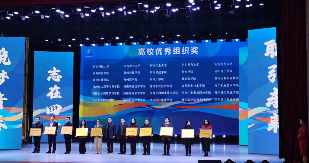 1月28日上午,第三届全国大学生职业规划大赛河南省赛颁奖仪式在洛阳师范学院音乐大厅举行。万象城官网师生再创佳绩,共斩获金奖1项、银奖1项、铜奖3项,学校被授予“优秀组织奖”。