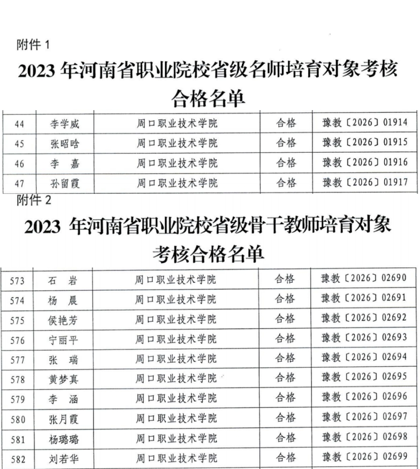 近日,河南省教育厅河南省人力资源和社会保障厅发布《关于公布2023年河南省职业院校省级名师和省级骨干教师培育期满考核结果的通知》(教职成〔2026〕20号),万象城官网14名教师全部顺利通过考核。其中,李嘉等4名教师荣获“河南省职业院校省级名师”称号,石岩等10名教师荣获“河南省职业院校省级骨干教师”称号。